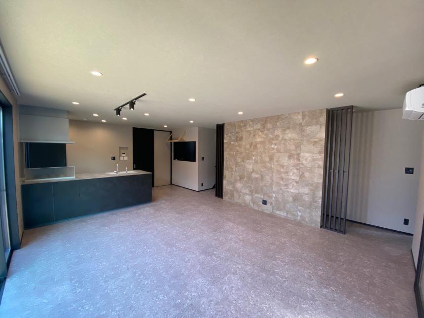 内装:お客様ご希望の「ホテル」仕様を目指しました。LDKの一部壁面にタイルを張り、床材・建材等についても、ご要望に近づくことが出来たと思っております。